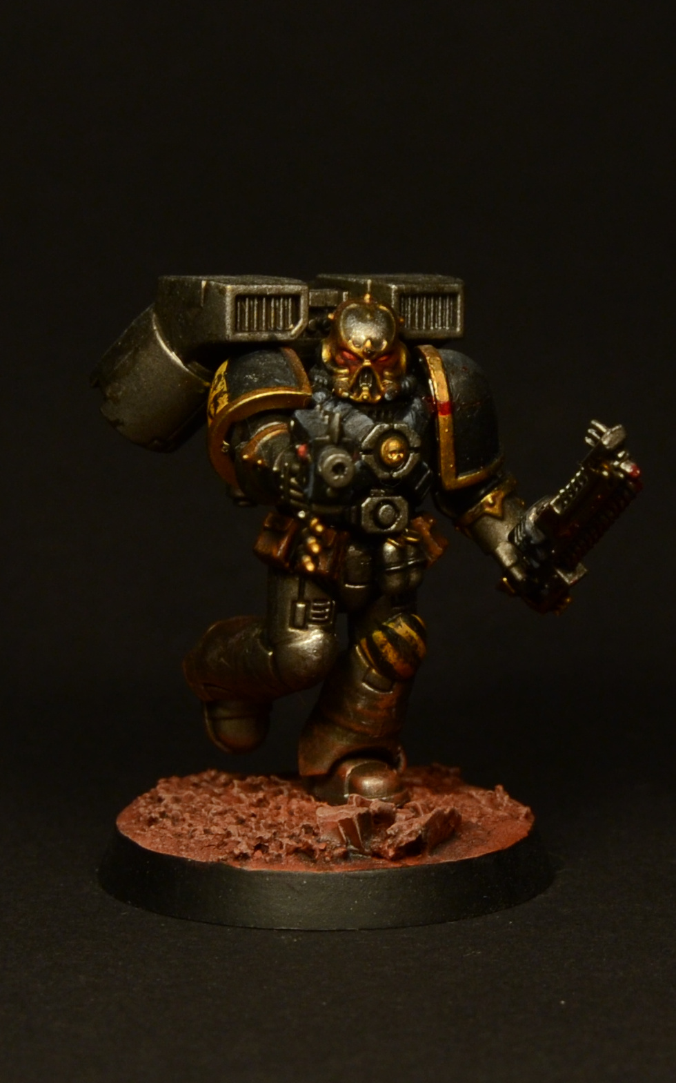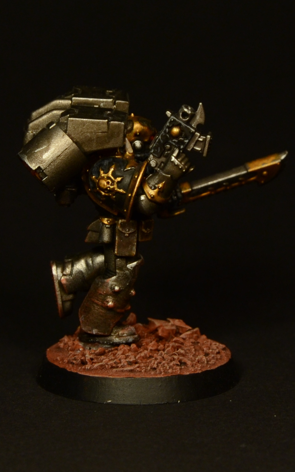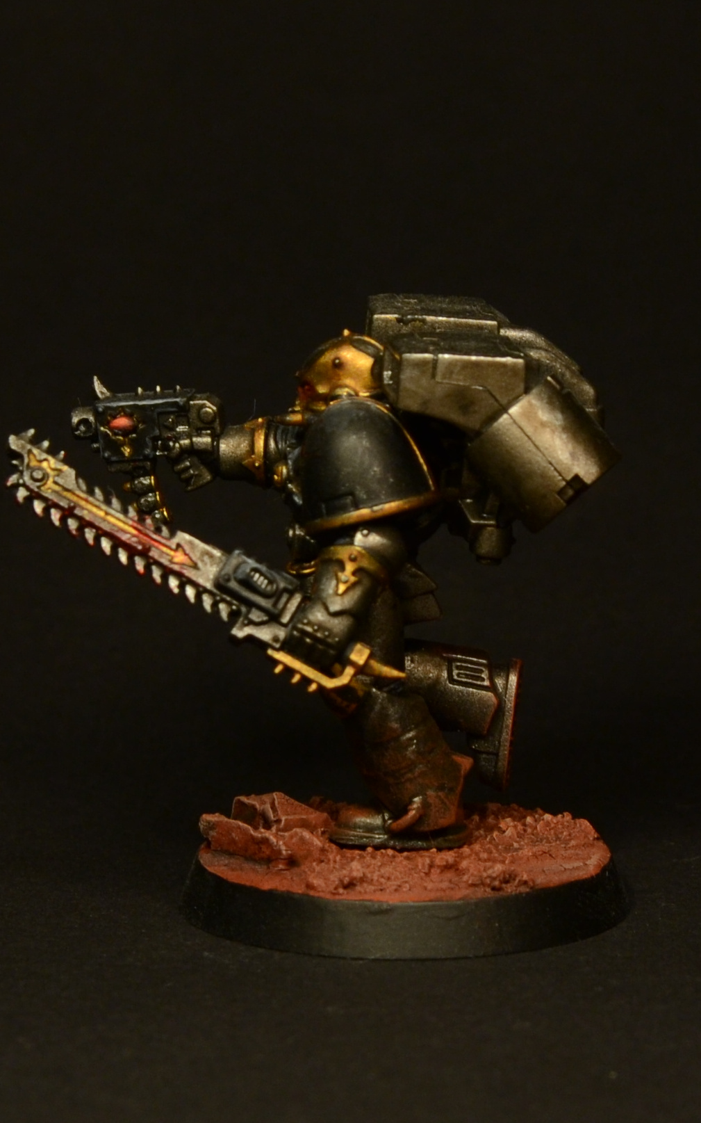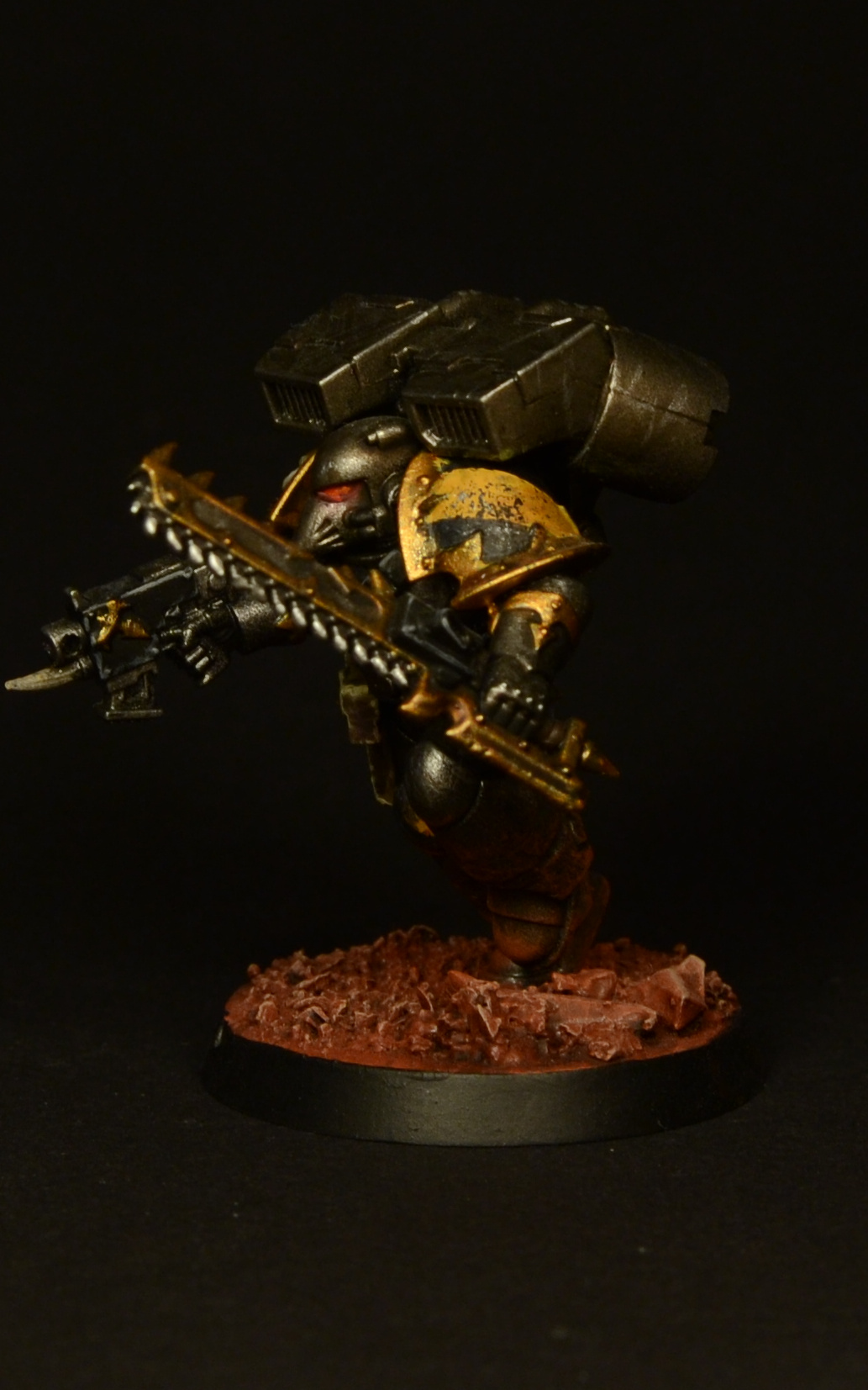 Since the legs of the Assault Marines look rather short compared to those of the Primaris and the new CSM releases, I made them slightly taller by adding a piece of plasticard to each one and smoothing it out with green stuff. As I was already cutting the legs apart, I decided to add some studs to make them look more brutal. Details of how the paint job was done can be found here.
