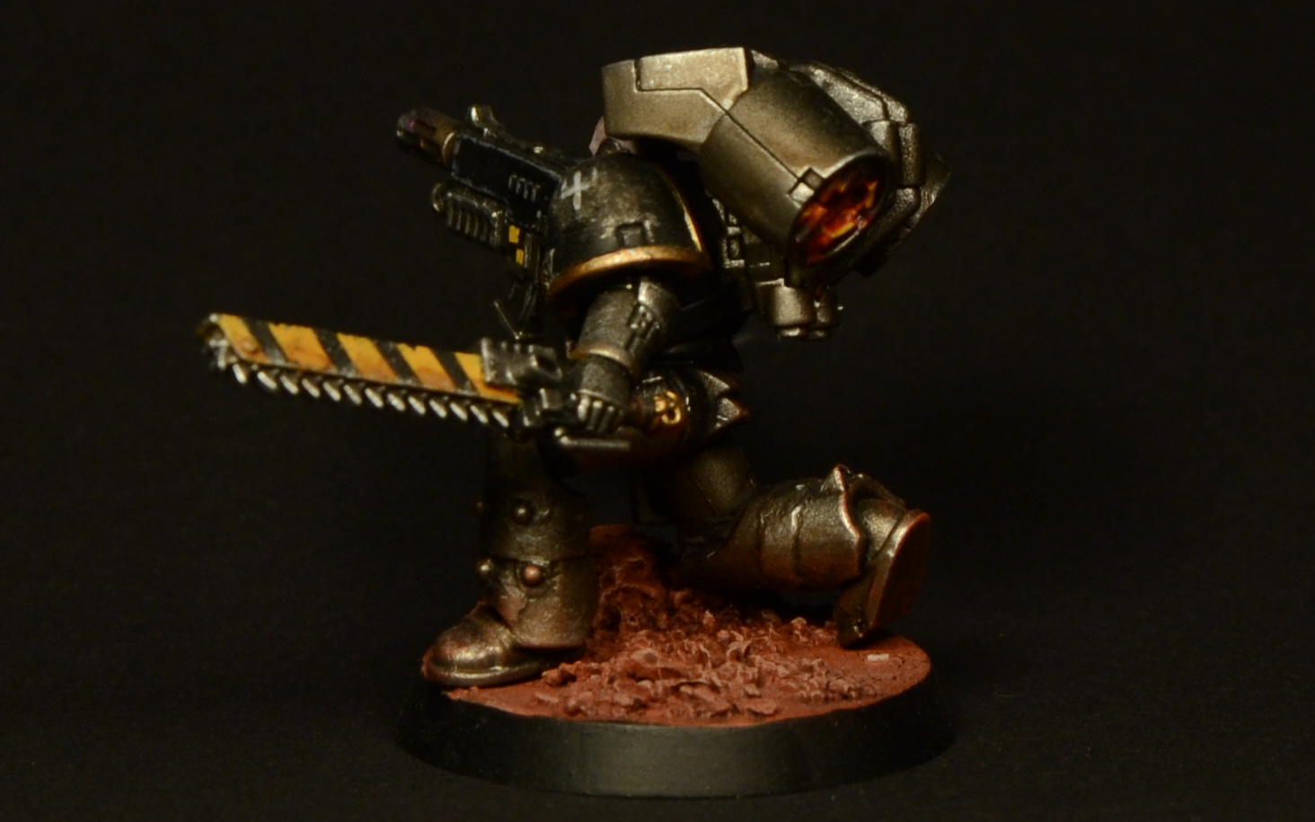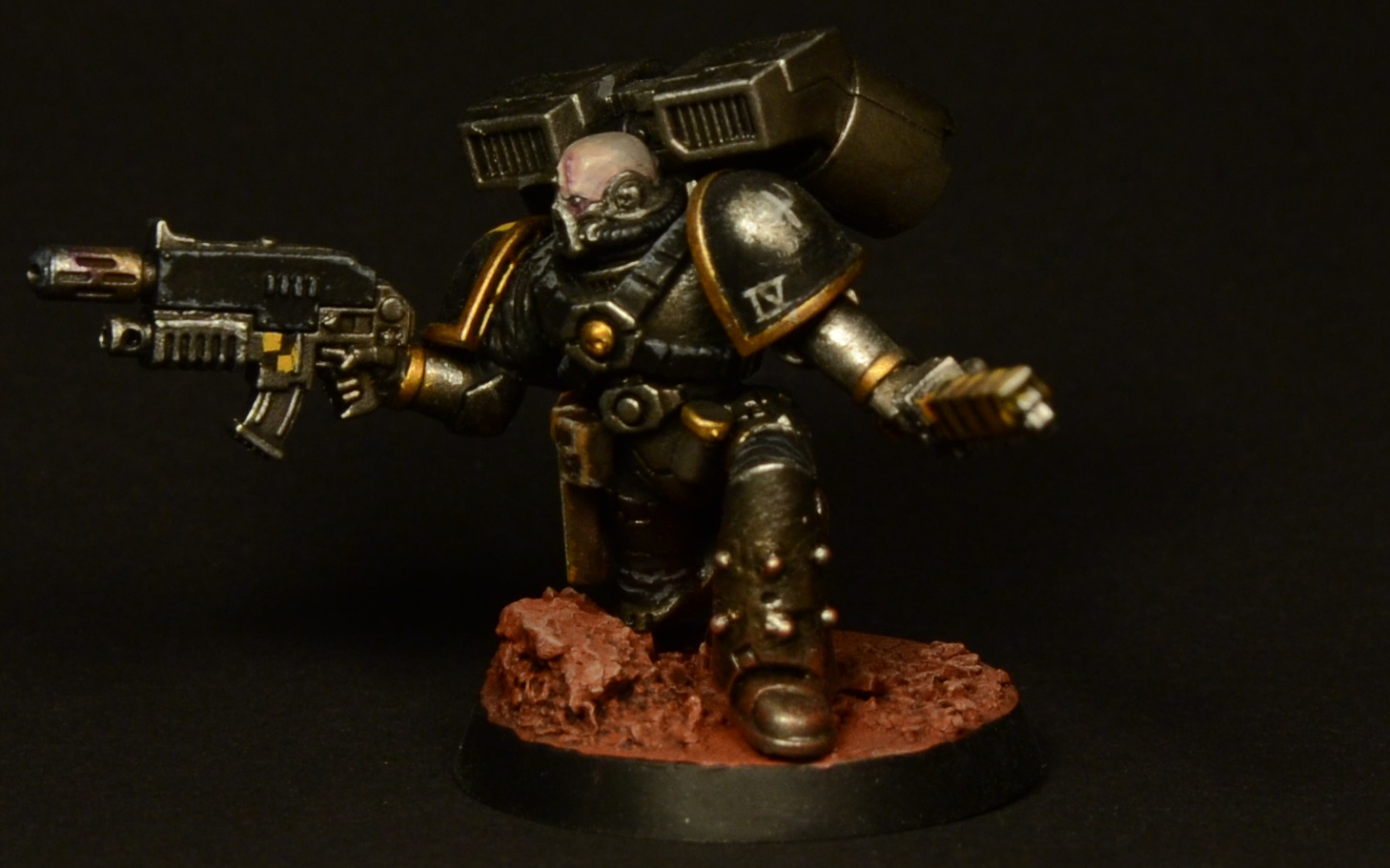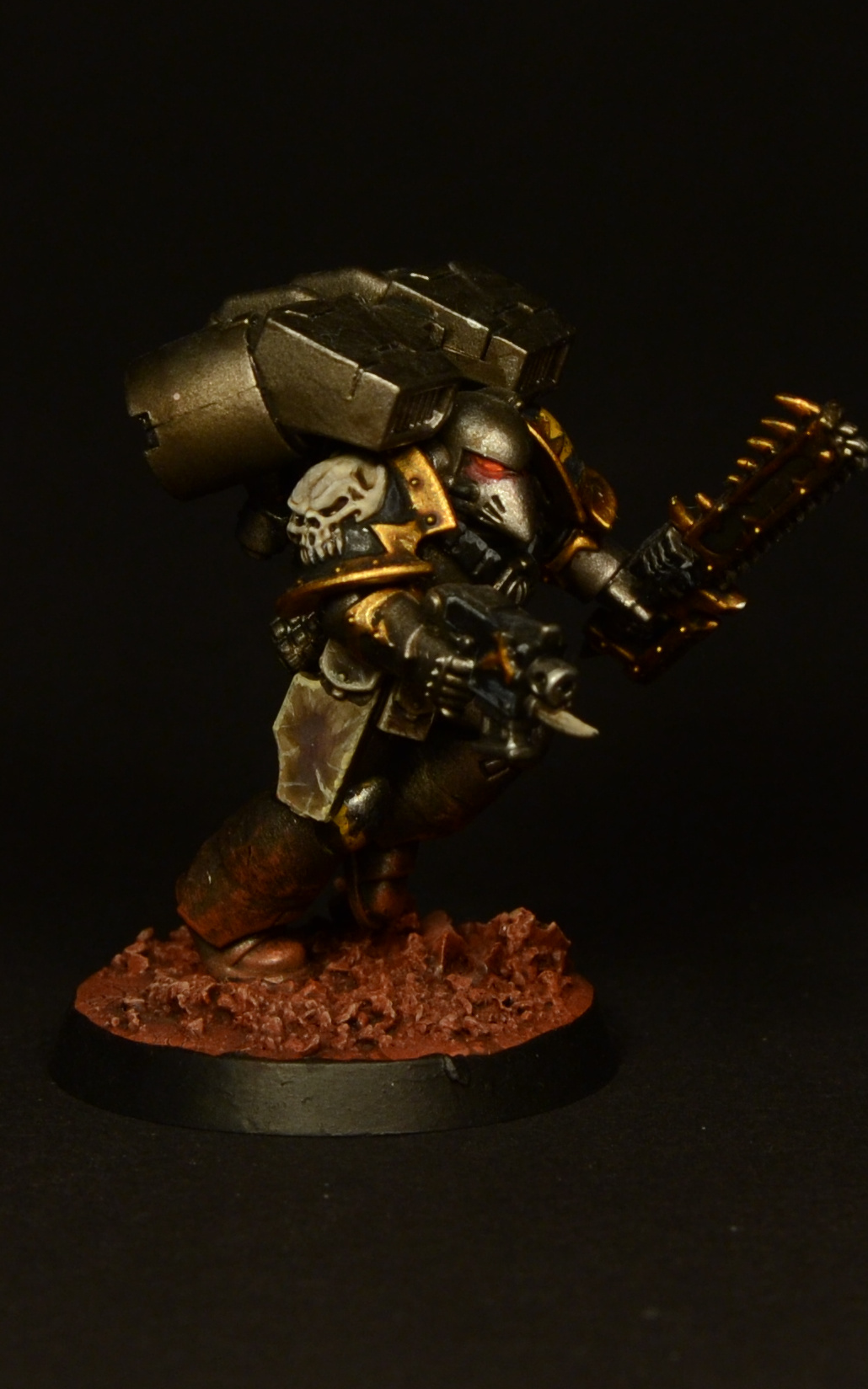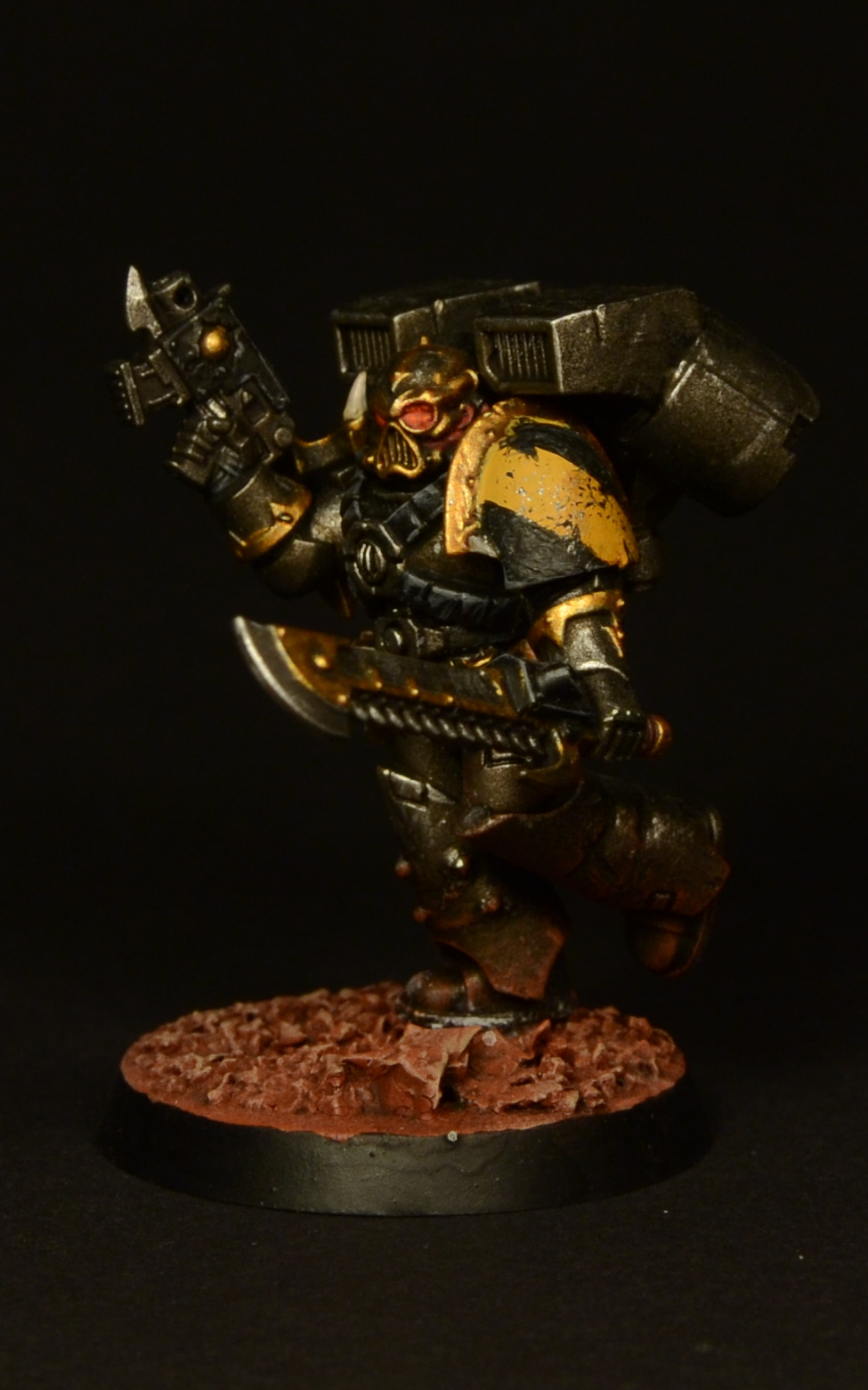 Since the legs of the Assault Marines look rather short compared to those of the Primaris and the new CSM releases, I made them slightly taller by adding a piece of plasticard to each one and smoothing it out with green stuff. As I was already cutting the legs apart, I decided to add some studs to make them look more brutal. Details of how the paint job was done can be found here.